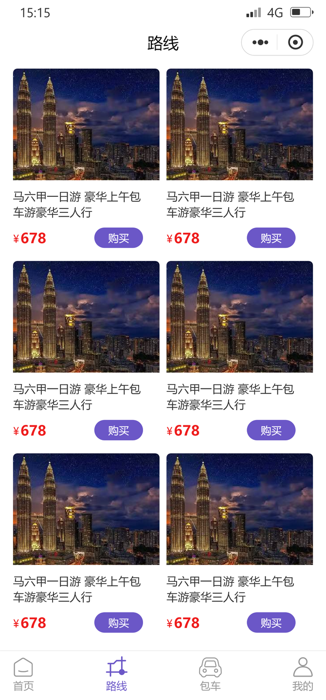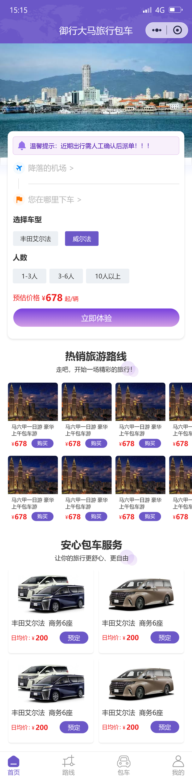 旅游包车小程序开发,包括有旅游线路展示,在线预定支付,租车信息展示,车辆详情介绍,在线预定车辆,会员中心等