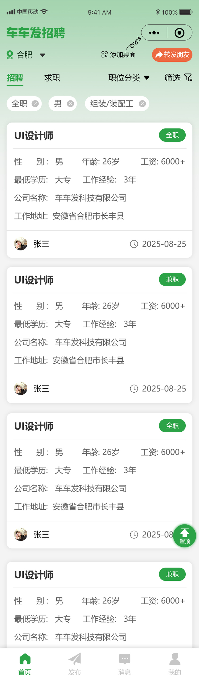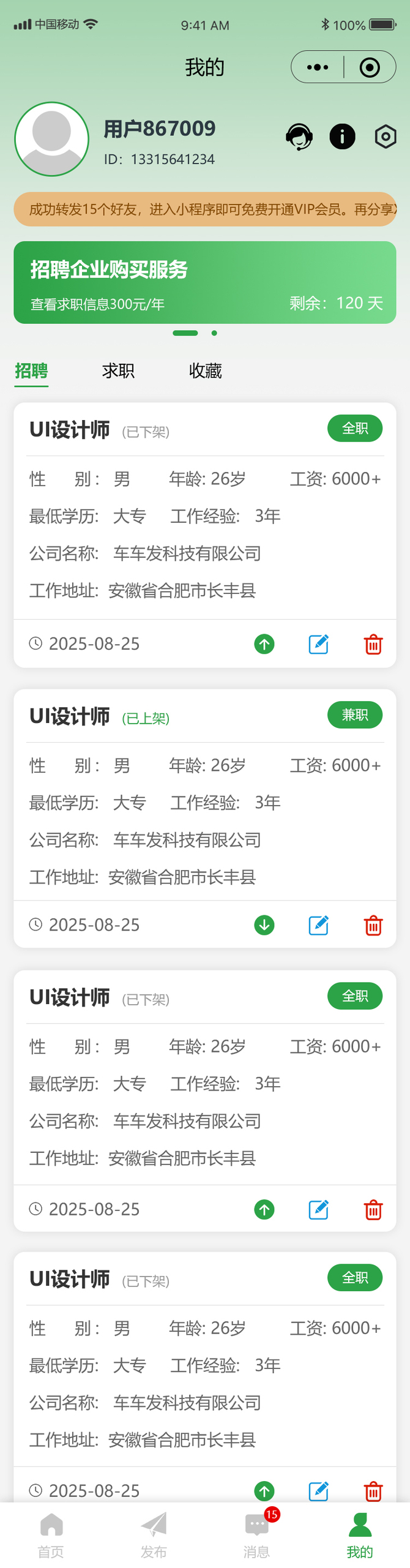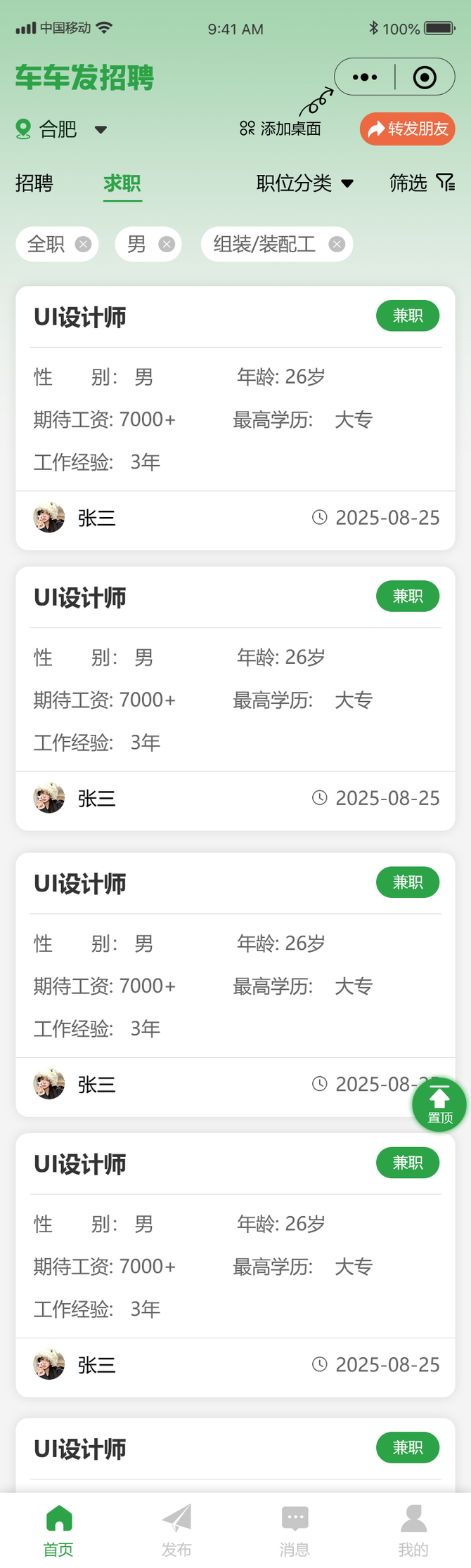 招聘求职小程序开发,分为招聘信息展示,求职信息展示,用户可以发布招聘信息,发布求职信息,在线展示发布者联系方式,在线投递简历,查看简历等功能