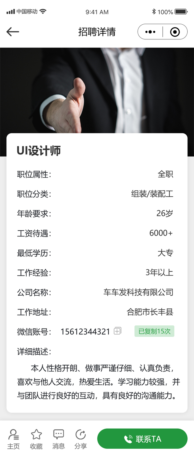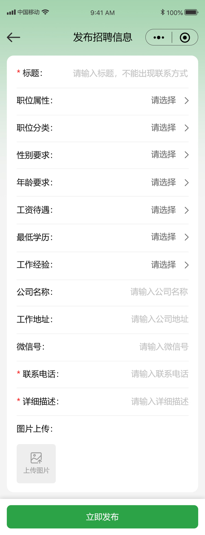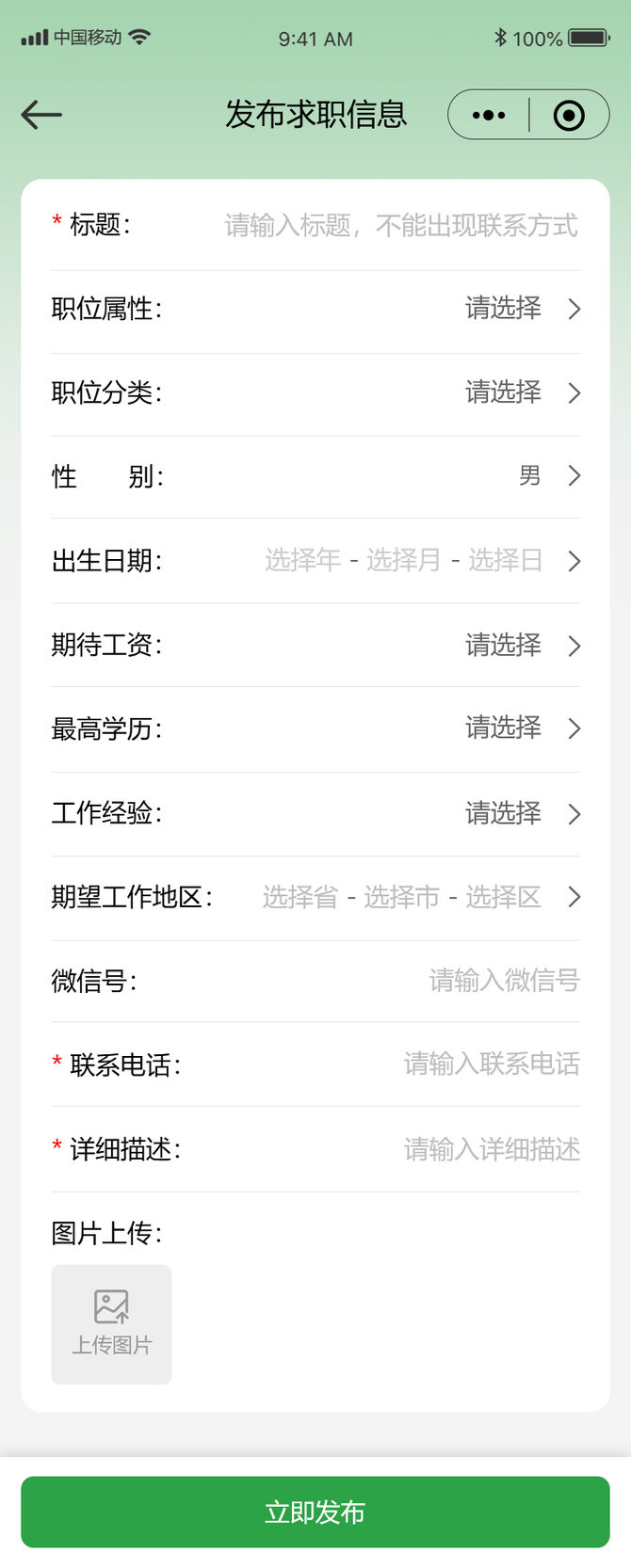 招聘求职小程序开发,分为招聘信息展示,求职信息展示,用户可以发布招聘信息,发布求职信息,在线展示发布者联系方式,在线投递简历,查看简历等功能